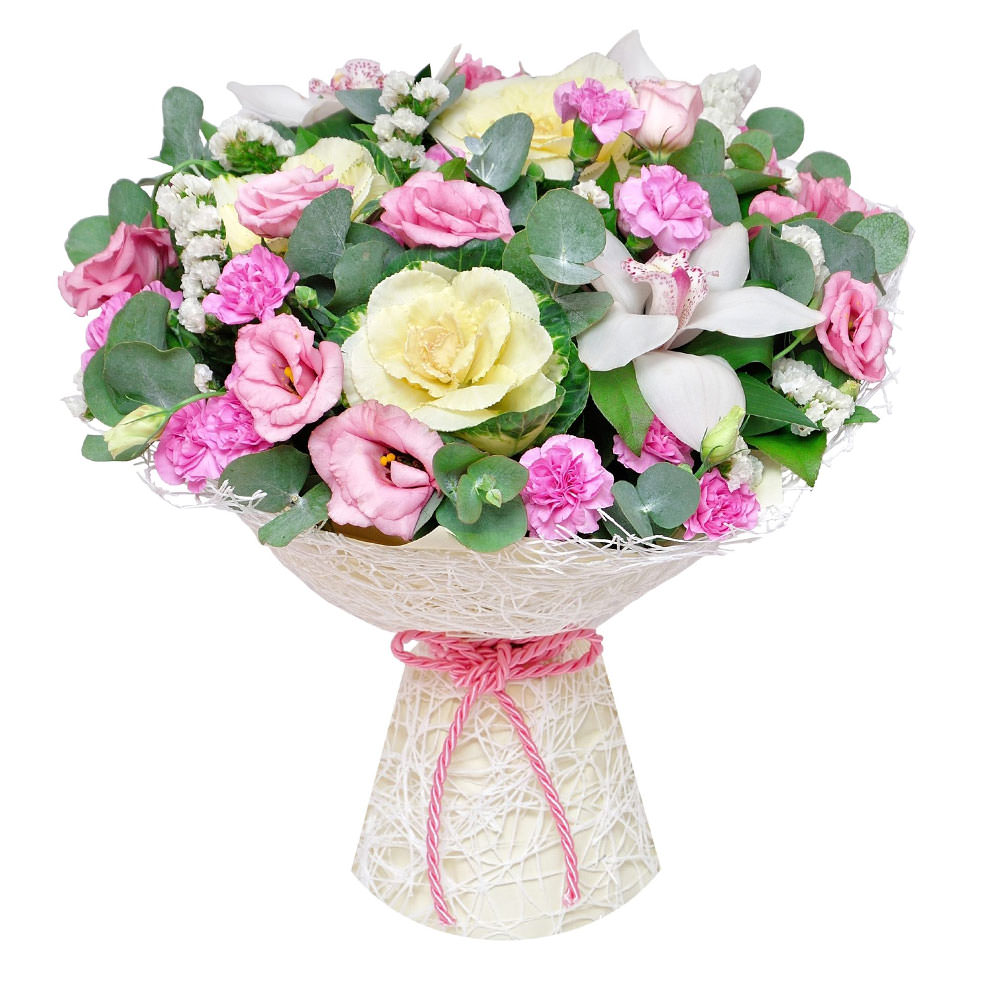 Эустома розовая, гвоздика кустовая мини розовая, орхидея белая, брассика, статица белая, эвкалипт. Упаковка (лента, пленка, крафт, сетка, пленка матовая)