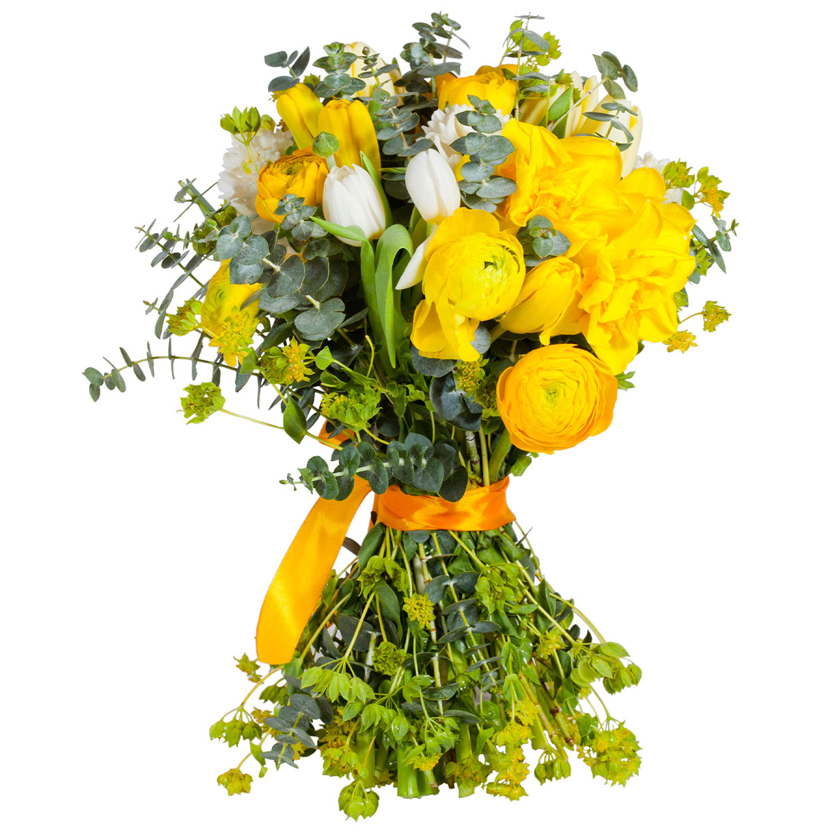 Ранункулюс желтый, тюльпан белый и желтый, зверобой, эвкалипт. Упаковка (лента, пленка, крафт, сетка, пленка матовая)