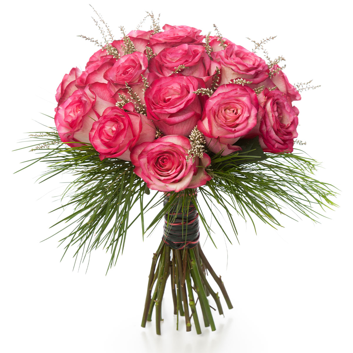 Роза одноголовая розовая, осока. Упаковка (лента, пленка, крафт, сетка, пленка матовая)