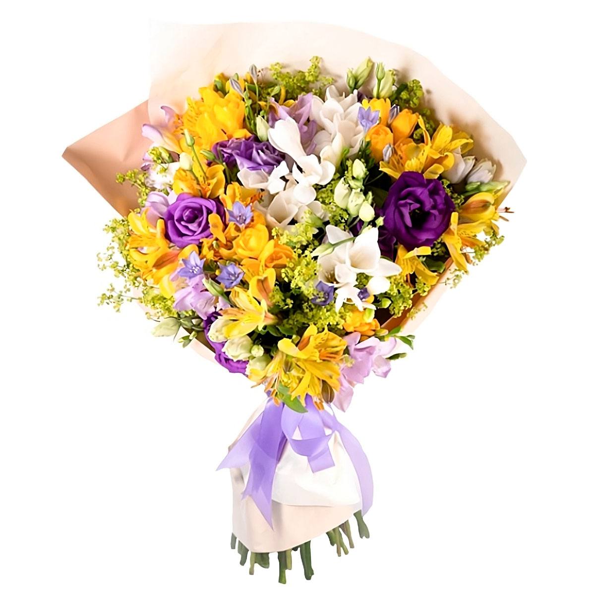 Фрезия белая, альстромерия желтая, эустома фиолетовая. Упаковка (лента, пленка, крафт, сетка, пленка матовая)