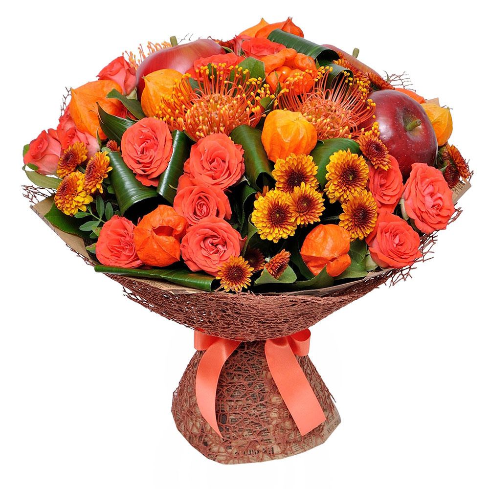 Роза кустовая оранжевая, ликорис, аспидистра, хризантема кустовая желтая, физалис. По фруктам уточняйте у менеджера! Упаковка (лента, пленка, крафт, сетка, пленка матовая)
