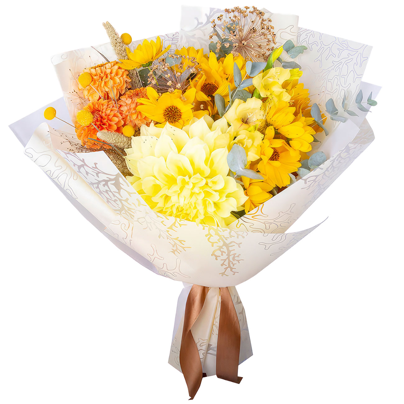 Георгина желтая и персиковая, хризантема балтика желтая, фрезия желтая, краспедия сухоцвет, эвкалипт. Упаковка (лента, пленка, крафт, сетка, пленка матовая)