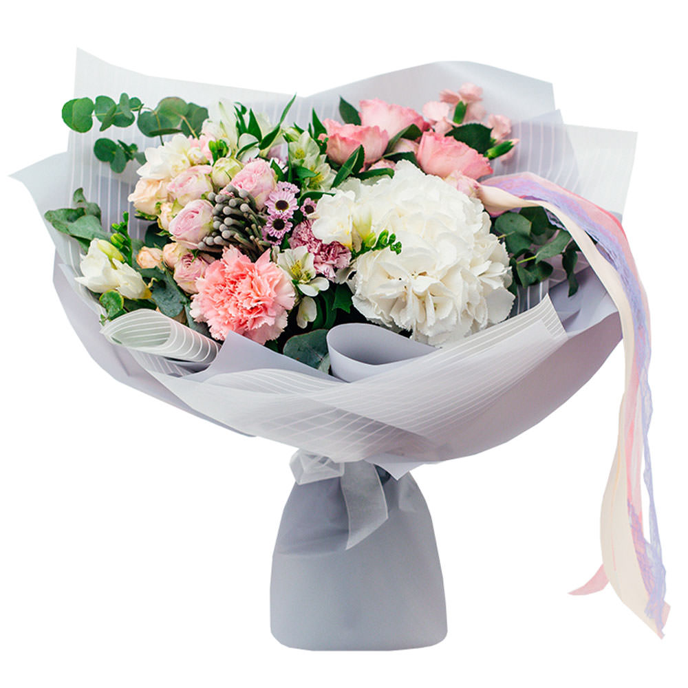 Гортензия белая, альстромерия белая, гвоздика розовая, гвоздика кустовая мини розовая, роза кустовая розовая, фрезия белая, хризантема сантини, бруния. Упаковка (лента, пленка, крафт, сетка, пленка матовая)