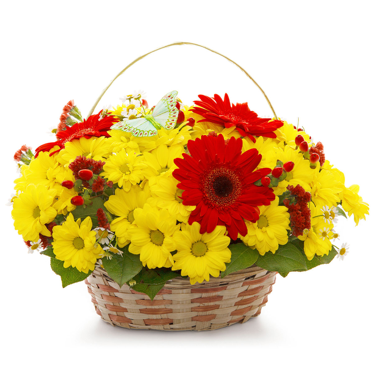 Гербера красная, хризантема кустовая желтая, ромашка, гиперикум, статица красная, декоративная бабочка. Упаковка (Корзина, оазис, ящик).
