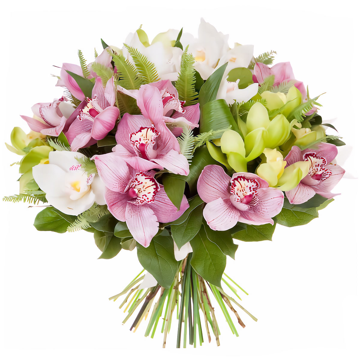 Орхидеи белые, розовые, зеленые.