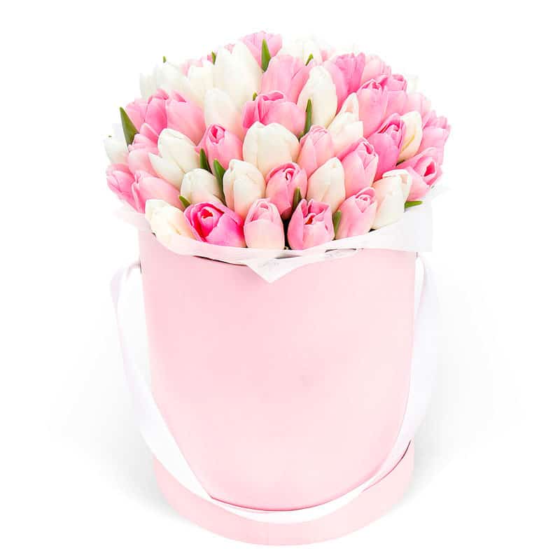 Тюльпаны микс (белый, розовый). Упаковка (шляпная коробка, квадратный бокс, коробка сердце, оазис)