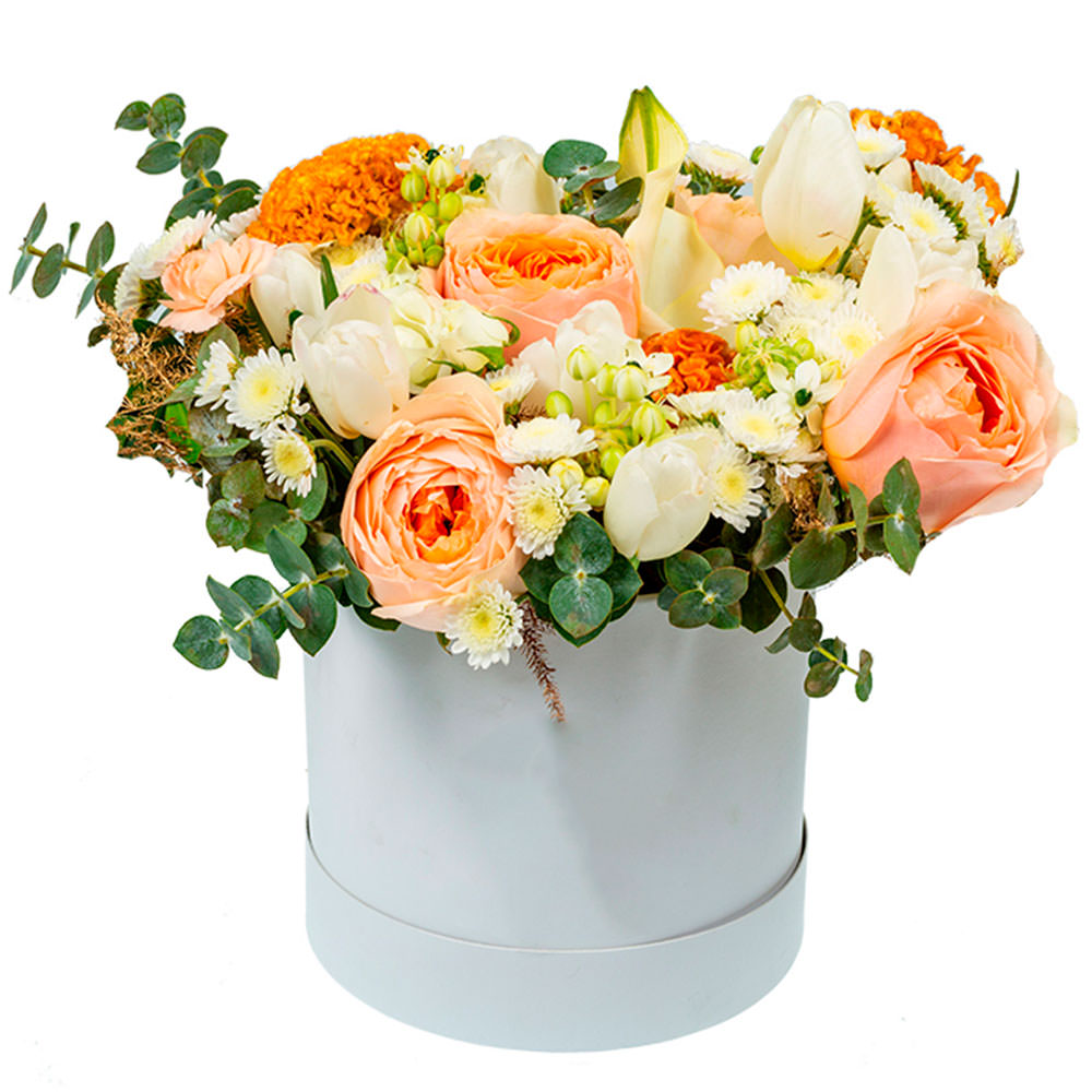 Роза одноголовая пионовидная персиковая, тюльпан белый, ромашка кустовая, эвкалипт, целозия, гвоздика кустовая мини кремовая, зелень. Упаковка (шляпная коробка, квадратный бокс, коробка сердце, оазис).