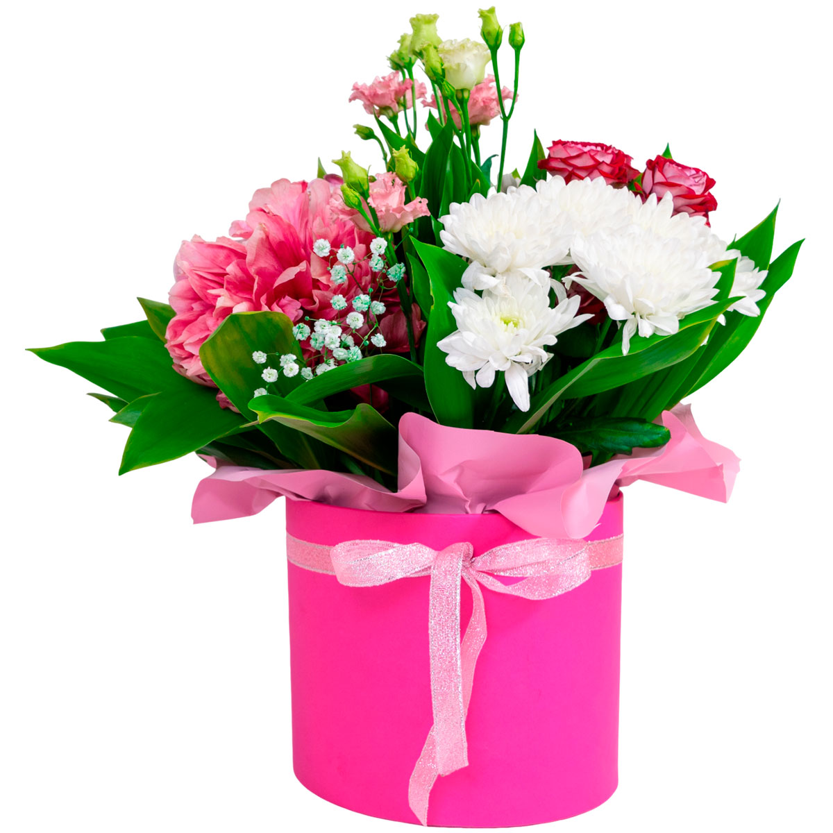 Хризантема кустовая белая, пион розовый, роза кустовая розовая, эустома белая, гипсофила. Упаковка (шляпная коробка, квадратный бокс, коробка сердце, оазис)